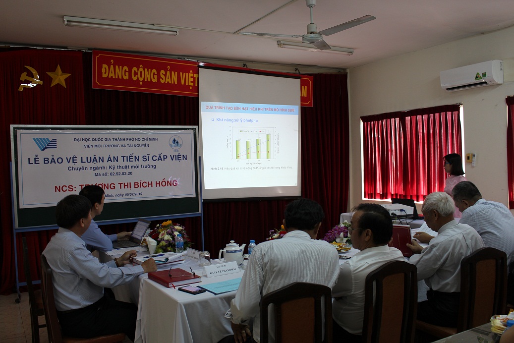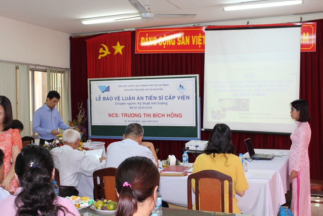 Sáng thứ Ba, ngày 09 tháng 7 năm 2019, Hội đồng chấm luận án Viện Môi trường và Tài nguyên, Đại học Quốc gia TP. Hồ Chí Minh đã họp để chấm luận án tiến sĩ cấp Viện cho NCS. Trương Thị Bích Hồng, chuyên ngành Kỹ thuật môi trường, Mã số: 62.52.03.20 với đề tài: “Nghiên cứu sự hình thành bùn hạt hiếu khí và đánh giá khả năng giảm nghẹt màng của mô hình bùn hạt hiếu khí kết hợp lọc màng (AGMBR)””.