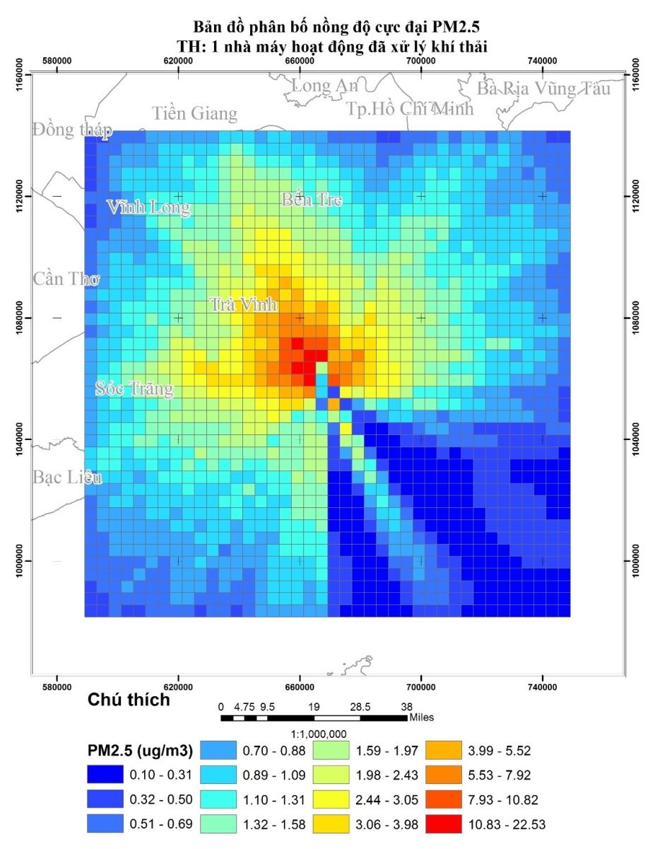 Hình 1. Bản đồ lan truyền PM2.5 trung bình cao nhất 1 giờ trong năm bằng mô hình CALPUFF.