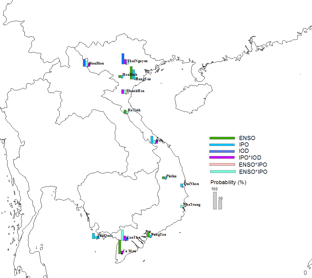 Kết quả cho thấy ENSO, IPO và IOD và sự tương tác của chúng có vai trò rất nhỏ trong việc ảnh hưởng đến lượng mưa ở miền bắc Việt Nam nhưng chúng có một số ảnh hưởng đến lượng mưa ở miền trung và miền nam Việt Nam.