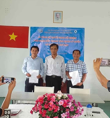 Hình ảnh: GS.TS Lê Thanh Hải trao quyết định cho TS. Trần Đức Dũng (trái) và TS. Lê Hữu Quang (phải)