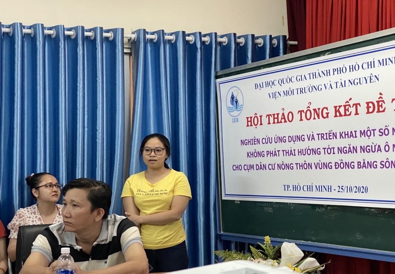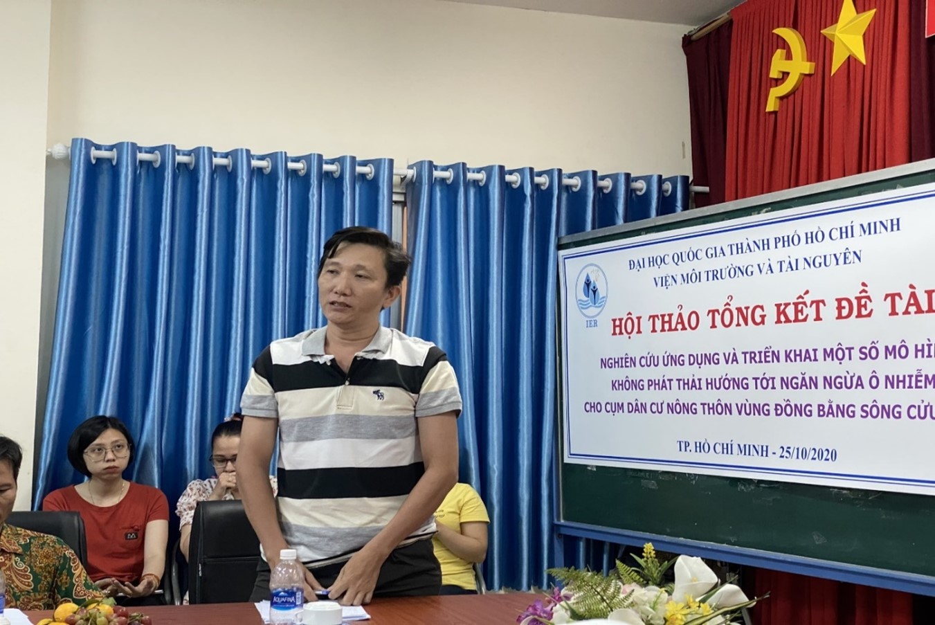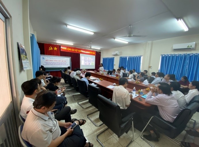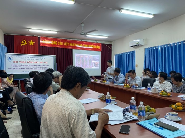 Ngày 25 tháng 10 năm 2020, tại Viện Môi trường và Tài nguyên – Đại học Quốc gia TP.HCM đã tổ chức Hội thảo tổng kết đề tài “Nghiên cứu ứng dụng và triển khai một số mô hình không phát thải hướng đến ngăn ngừa ô nhiễm cho cụm dân cư nông thôn vùng đồng bằng sông Cửu Long” với sự tham gia của các chuyên gia đến từ các trường Đại học, Viện nghiên cứu trên địa bàn TP.HCM, Đại diện Văn phòng chương trình Tây Nam Bộ, cán bộ và học viên của Viện Môi trường và Tài nguyên, đại diện UBND và các hộ dân xã An Định, huyện Mỏ Cày Nam, tỉnh Bến Tre
