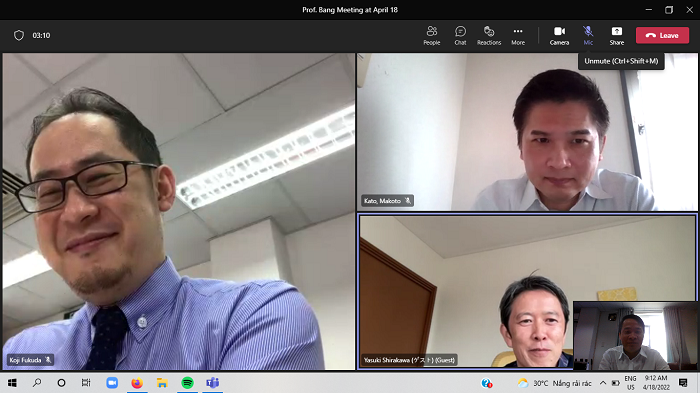 Bên lề cuộc họp, TS. Koji Fukuda, Cố vấn cao cấp JICA đã có cuộc gặp gỡ và trao đổi ngắn với GS.TS. Lê Thanh Hải, Viện trưởng VMT&TN về hướng nghiên cứu Kinh tế tuần hoàn - cũng là một cấu phần quan trọng trong dự án JICA-SPI-NDC-Vietnam.
