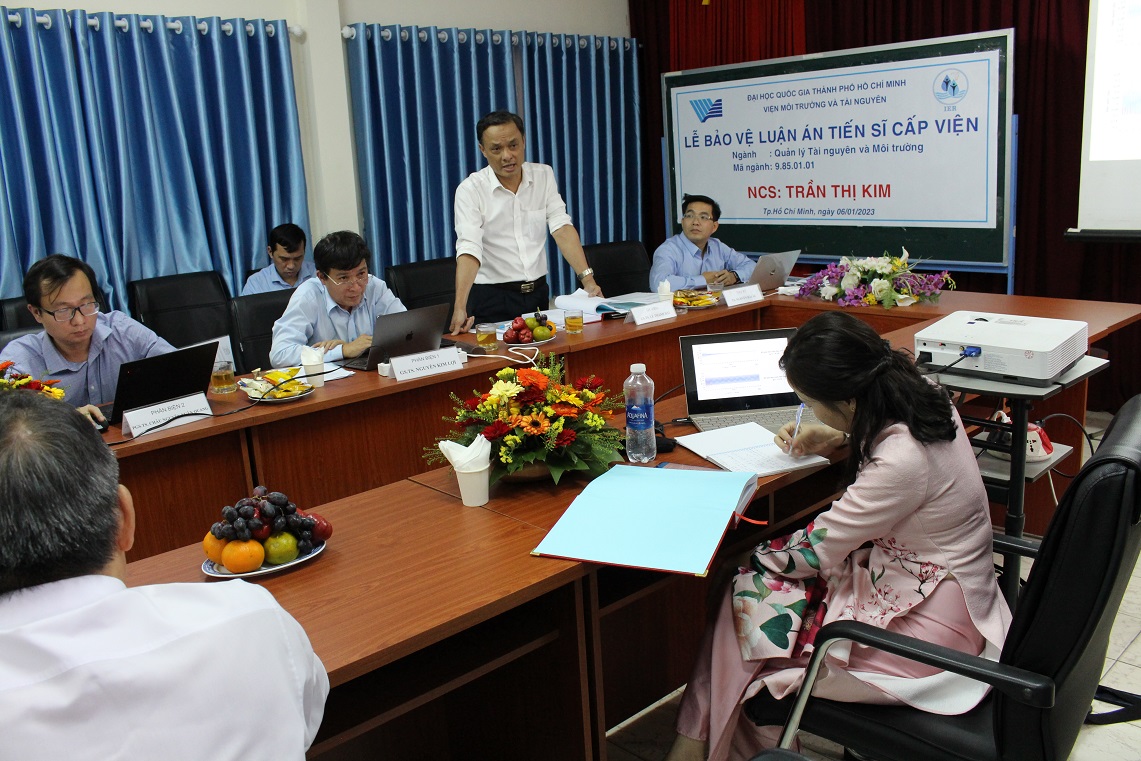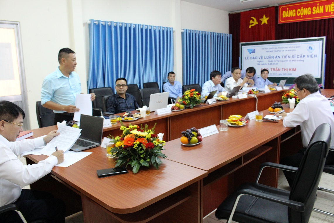 GS.TS. Trần Đình Hòa (Viện trưởng Viện Khoa học Thủy lợi Việt Nam), chủ tịch Hội đồng đã điều khiển phiên họp. Ba Ủy viên phản biện của luận án tiến sĩ là GS.TS. Nguyễn Kim Lợi (Trường ĐH Nông Lâm), PGS.TS. Châu Nguyễn Xuân Quang (Viện MT&TN - ĐHQG-HCM) và PGS.TS. Phạm Ngọc (Trường ĐH Quốc Tế - ĐHQG-HCM). Hội đồng có sự tham gia của hai ủy viên là GS.TS. Lê Thanh Hải (Viện MT&TN - ĐHQG-HCM) và TS.Nguyễn Đình Vượng (Viện Khoa học Thủy lợi Miền Nam) cùng thư ký hội đồng là TS. Nguyễn Hải Âu (Viện MT&TN - ĐHQG-HCM).