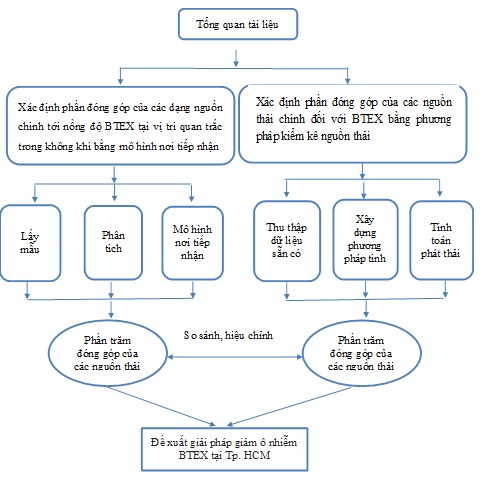 Nghiên cứu xác định các nguồn phân bổ BTEX bằng cách sử dụng hai cách tiếp cận: tính toán lượng phát thải (EI) và mô phỏng bằng mô hình PMF. Nghiên cứu đã kiểm kê nhiều nguồn phát thải BTEX tại TP.HCM để xác định nguyên nhân gây ô nhiễm. Một phương pháp cải tiến với sự kết hợp bottom-up và top-down đã được áp dụng để tiến hành kiểm kê phát thải, trong đó mô hình EMISENS được sử dụng để tính cho các nguồn giao thông đường bộ và phương pháp hệ số phát thải được sử dụng cho các nguồn phát thải khác.