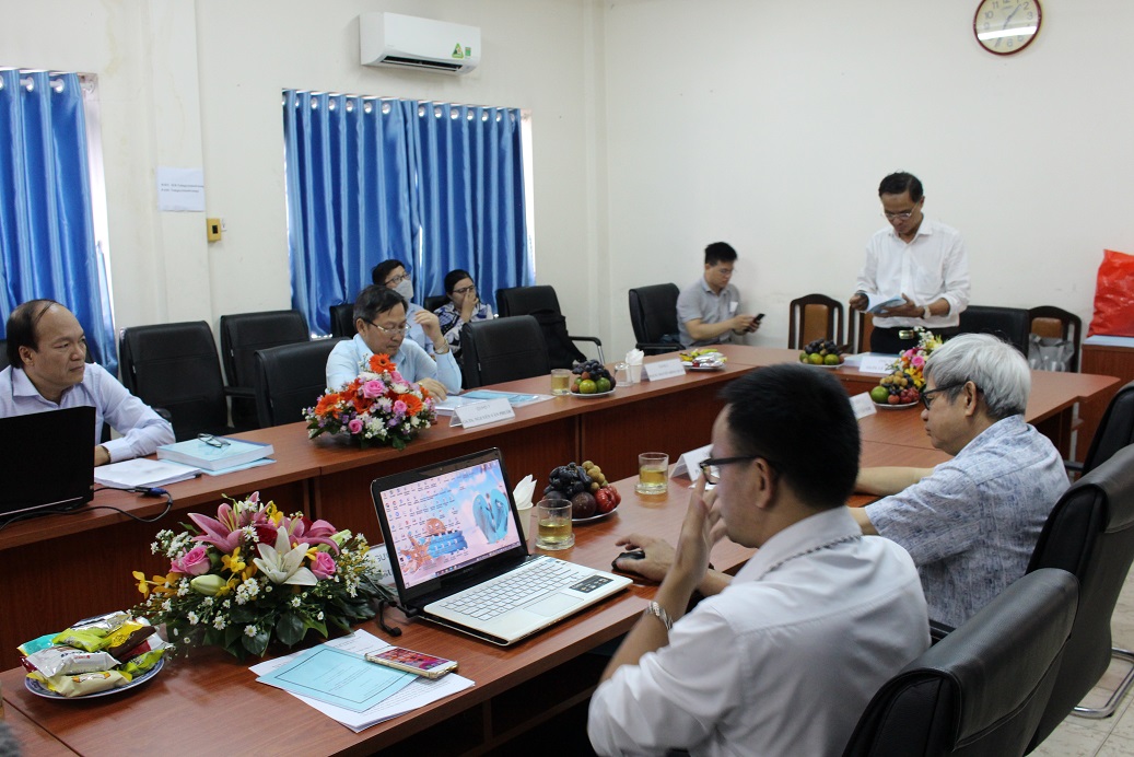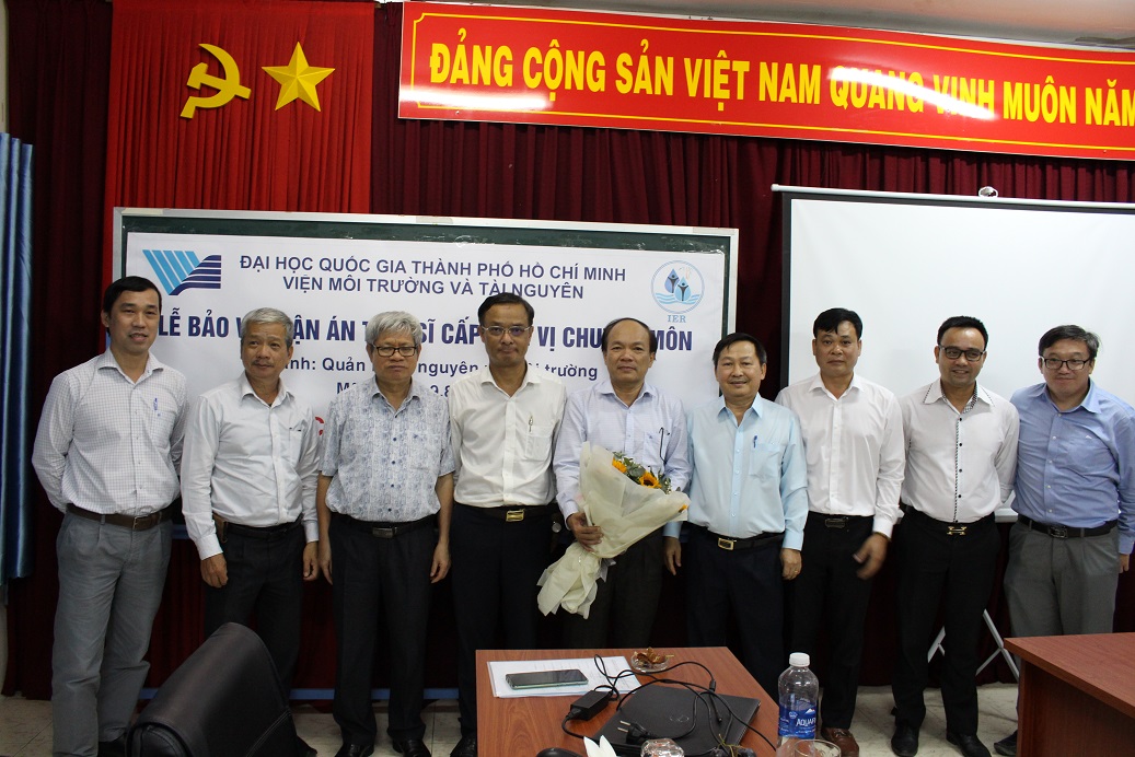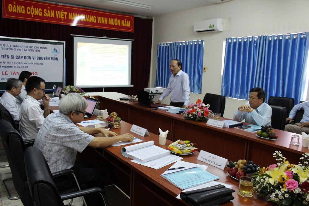GS.TS. Lê Thanh Hải, chủ tịch Hội đồng đã điều khiển phiên họp. Hai người giới thiệu của luận án tiến sĩ là TS. Nguyễn Đình Vượng (Viện Khoa học Thủy lợi miền Nam) và PGS.TS. Lê Văn Khoa (Trường ĐH Bách Khoa, ĐHQG-HCM). Hội đồng có sự tham gia của ba ủy viên là PGS.TS. Phùng Chí Sỹ (Trung tâm Công nghệ môi trường ENTEC), PGS. TS. Vũ Văn Nghị (Trường ĐH KHTN, ĐHQG-HCM), TS. Nguyễn Văn Hồng (Phân viện Khoa học KTTV và BĐKH) cùng thư ký hội đồng là TS. Hồ Minh Dũng (Viện MT&TN – ĐHQG-HCM). Buổi bảo vệ đã diễn ra long trọng với sự tham gia của GVHD, cán bộ khoa học, NCS, HVCH trong và ngoài Viện.