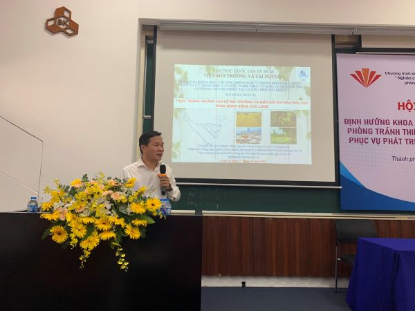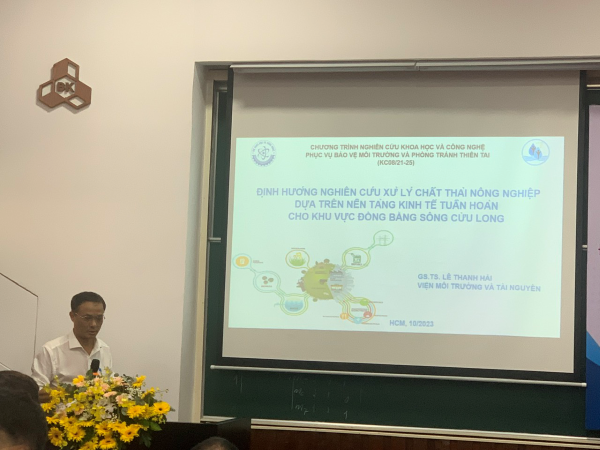 Các nhà khoa học của Viện Môi trường và Tài nguyên đã tích cực đóng góp cho Chương trình với hai báo cáo tham luận về: “Định hướng nghiên cứu xử lý chất thải nông nghiệp dựa trên nền tảng kinh tế tuần hoàn cho khu vực ĐBSCL” (GS.TS. Lê Thanh Hải, Viện trưởng, Phó chủ nhiệm Chương trình) và “Thực trạng những vấn đề môi trường và biến đổi khí hậu khu vực ĐBSCL” (PGS.TS. Hồ Quốc Bằng).