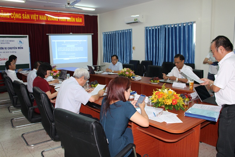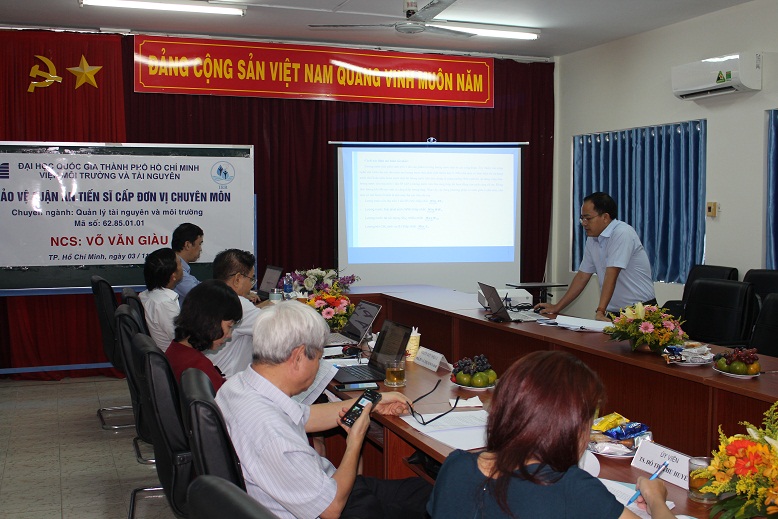 GS.TS. Nguyễn Phước Dân, chủ tịch Hội đồng đã điều khiển phiên họp. Hai người giới thiệu của luận án tiến sĩ là PGS.TS. Trương Thanh Cảnh (Trường ĐH KHTN, ĐHQG-HCM) và PGS.TS. Lê Thị Kim Oanh (Trường ĐH Văn Lang). Hội đồng có sự tham gia của ba ủy viên là PGS.TS. Phùng Chí Sỹ (Trung tâm Công nghệ môi trường ENTEC), TS. Thái Vũ Bình (Viện Môi trường và Tài nguyên, ĐHQG-HCM), TS. Đỗ Thị Thu Huyền (Viện Môi trường và Tài nguyên, ĐHQG-HCM) cùng thư ký hội đồng là TS. Hồ Minh Dũng (Viện Môi trường và Tài nguyên, ĐHQG-HCM). Buổi bảo vệ đã diễn ra long trọng với sự tham gia của GVHD, cán bộ khoa học, NCS, HVCH trong và ngoài Viện.