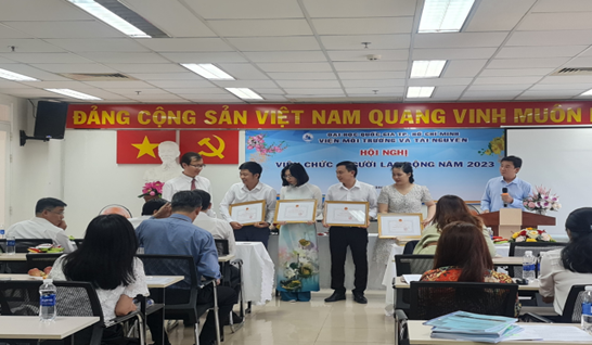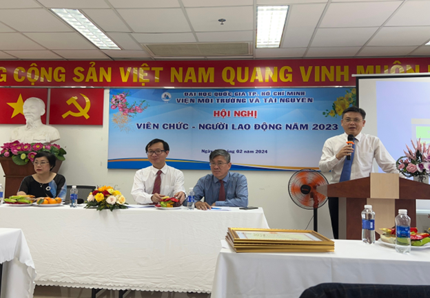 Tại hội nghị PGS.TS. Châu Nguyễn Xuân Quang, Phó Viện trưởng đã trình bày tóm tắt về những thành tích mà Viện đã đạt được trong năm 2023. Qua báo cáo có thể nhận thấy được sự cố gắng của tất viên chức – người lao động với số bài báo báo công bố trên các tạp chí chuyên ngành quốc tế uy tính tăng mạnh đạt hiệu suất 4,17 bài báo /1 Tiến sỹ, số lượng đề tài cấp trọng điểm đang được triển khai tích cực,… Vừa qua, Viện Môi trường và Tài nguyên đã vinh dự có 01 cán bộ được công nhận đạt chuẩn chức danh Phó Giáo sư và 01 cán bộ thuộc Viện đã bảo vệ thành công luận án Tiến sỹ cấp cơ sở đào tạo. Nhìn chung, đa phần các chỉ tiêu phấn đấu trong nghị quyết Hội nghị Viên chức – Người lao động năm 2023 đã đạt được kết quả tốt và có nhiều khởi sắc, dự báo trong năm 2024 sẽ có chuyển biến tích cực hơn.