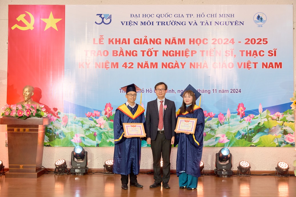Nhân dịp này, Lãnh đạo Viện cũng tặng Giấy khen của Viện trưởng cho tân Thạc sĩ Phạm Hà Ngọc Mỹ (ngành QLTN&MT, K2022) và Đặng Trần Nhật Minh (ngành KTMT, K2022) đã có thành tích học tập tốt trong đợt trao bằng tốt nghiệp năm 2024, và tân Tiến sĩ Nguyễn Thị Thu Thảo có công bố khoa học xuất sắc trong suốt khóa học (3 công bố khoa học quốc tế với tổng chỉ số IF=20).
