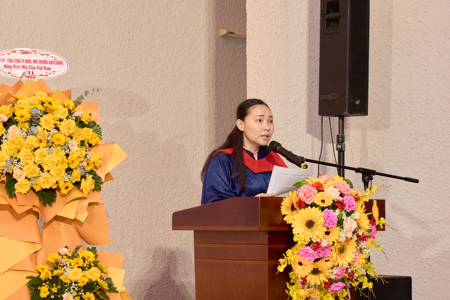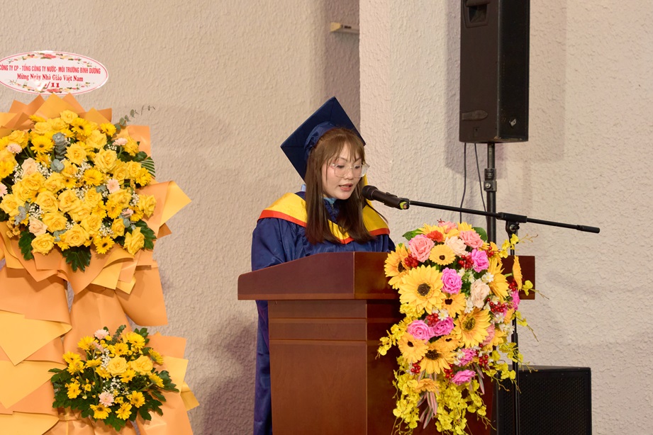Hình 12. Đại diện các tân Thạc sĩ (ThS. Phạm Hà Ngọc Mỹ) phát biểu cảm tưởng tại buổi lễ