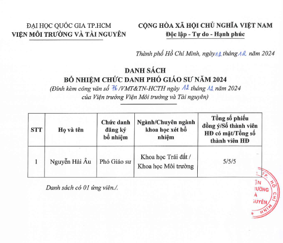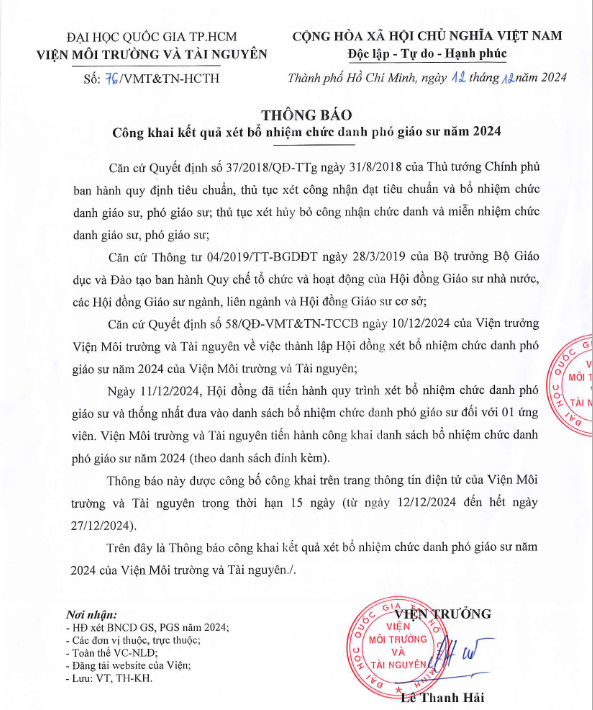 Ngày 12 tháng 12 năm 2024, Viện Môi trường và Tài nguyên - Đại học Quốc gia TP.HCM ban hành công văn số 76/VMT&TN-HCTH thông báo công khai kết quả xét bổ nhiệm chức danh phó giáo sư năm 2024.
