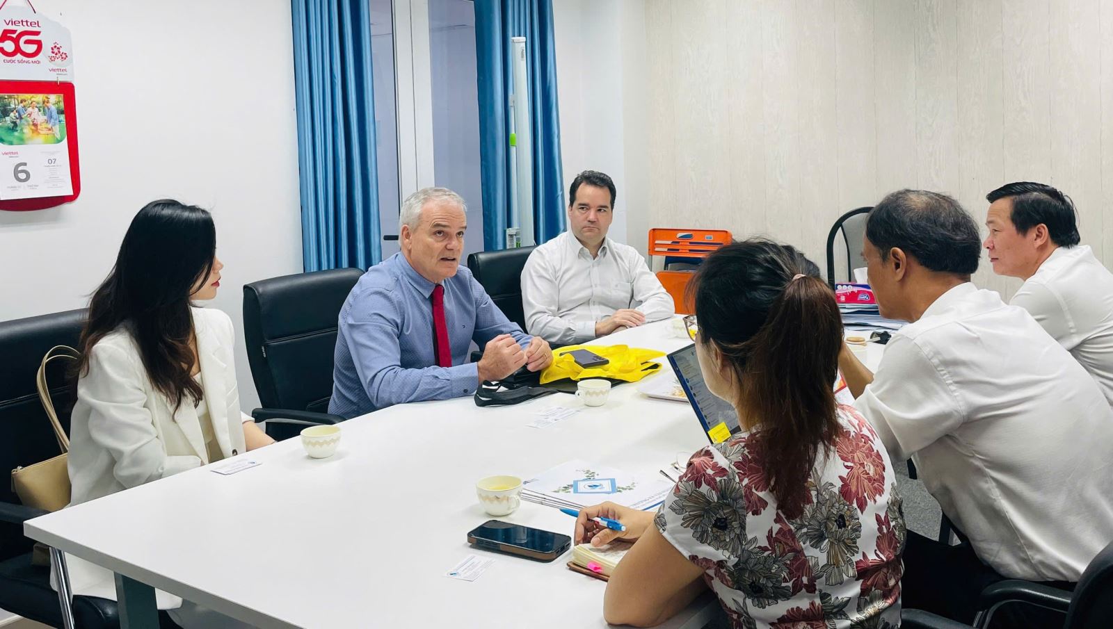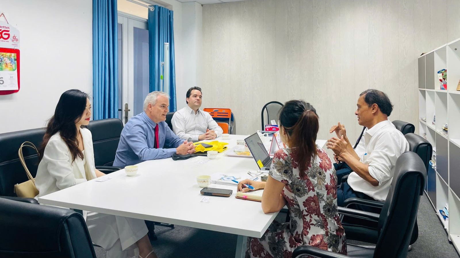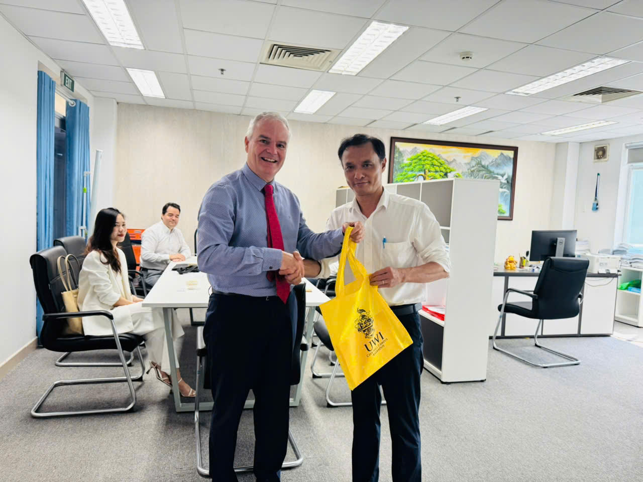 Đoàn khách đến thăm gồm có Giáo sư R. Clive Landis - Hiệu trưởng Cơ sở Cave Hill thuộc UWI, Ông Colin Blackwell - Chủ tịch Ủy ban Nhân sự của Diễn đàn Doanh nghiệp Việt Nam (đồng sáng lập Hyperion Fintech AG & Enablecode) và cô Trang - thư ký tháp tùng đoàn.