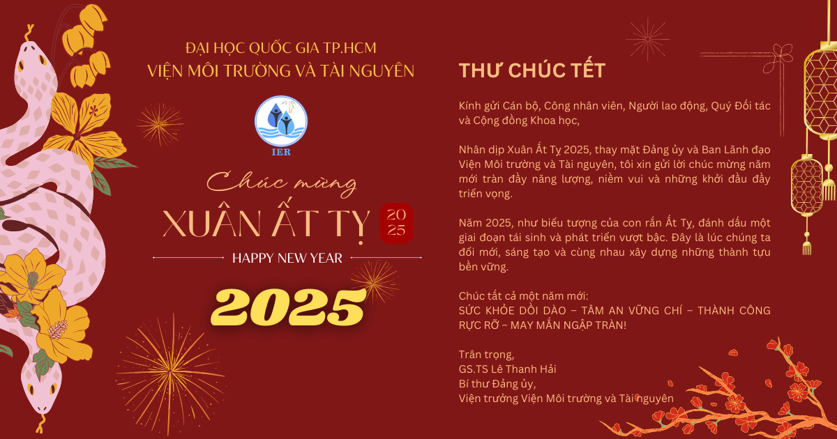Nhân dịp Xuân Ất Tỵ 2025, thay mặt Đảng ủy và Ban Lãnh đạo Viện Môi trường và Tài nguyên, tôi xin gửi lời chúc mừng năm mới tràn đầy năng lượng, niềm vui và những khởi đầu đầy triển vọng.