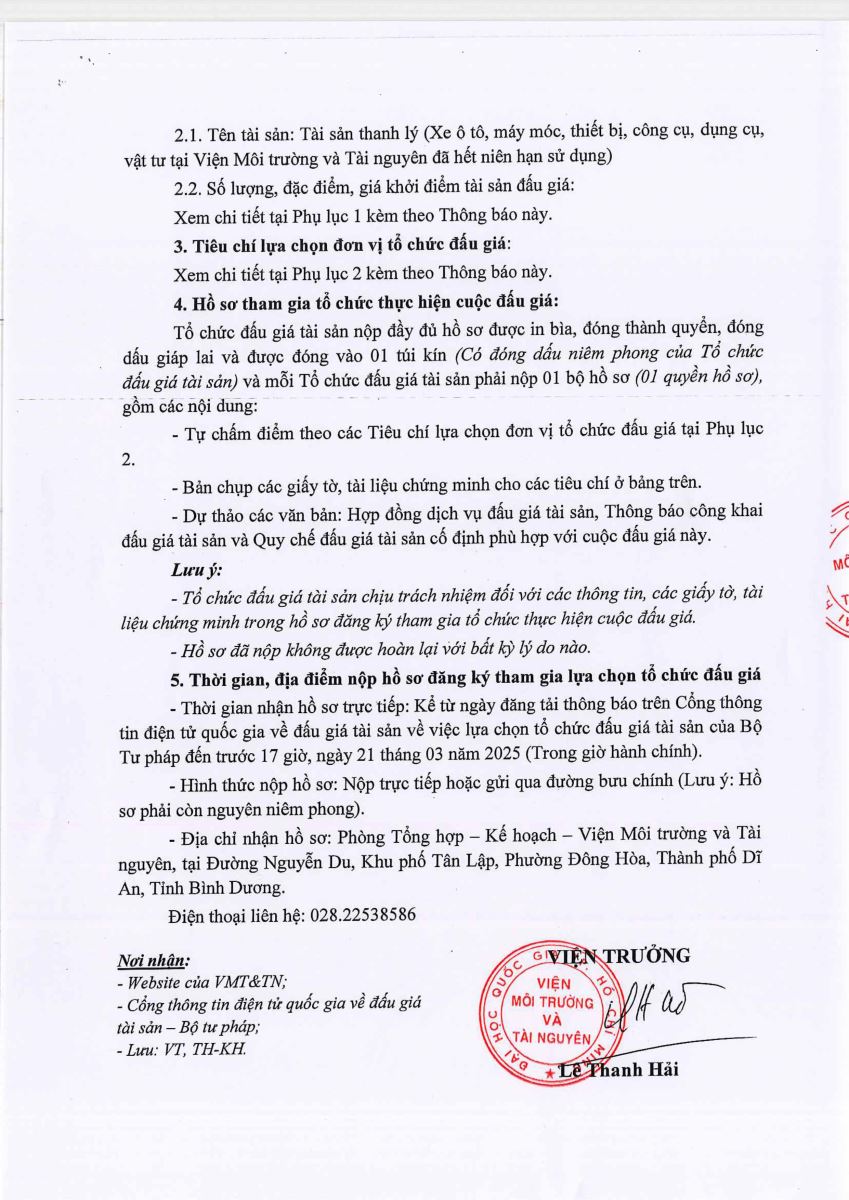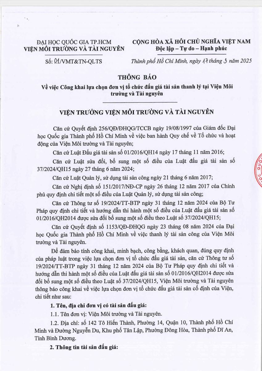 Ngày 17/03/2025, Viện Môi trường và Tài nguyên ban hành Thông báo số 01/VMT&TN-QLTS về việc Công khai lựa chọn đơn vị tổ chức đấu giá tài sản thanh lý tại Viện Môi trường và Tài nguyên.