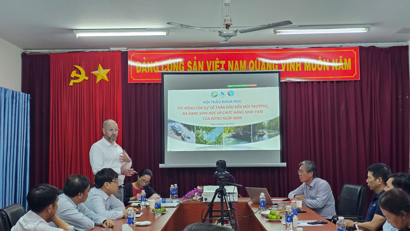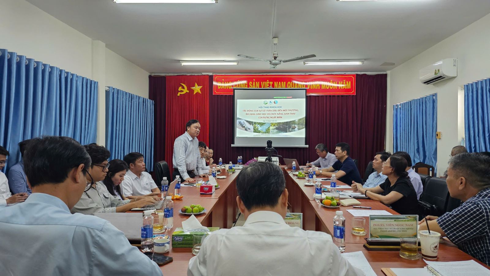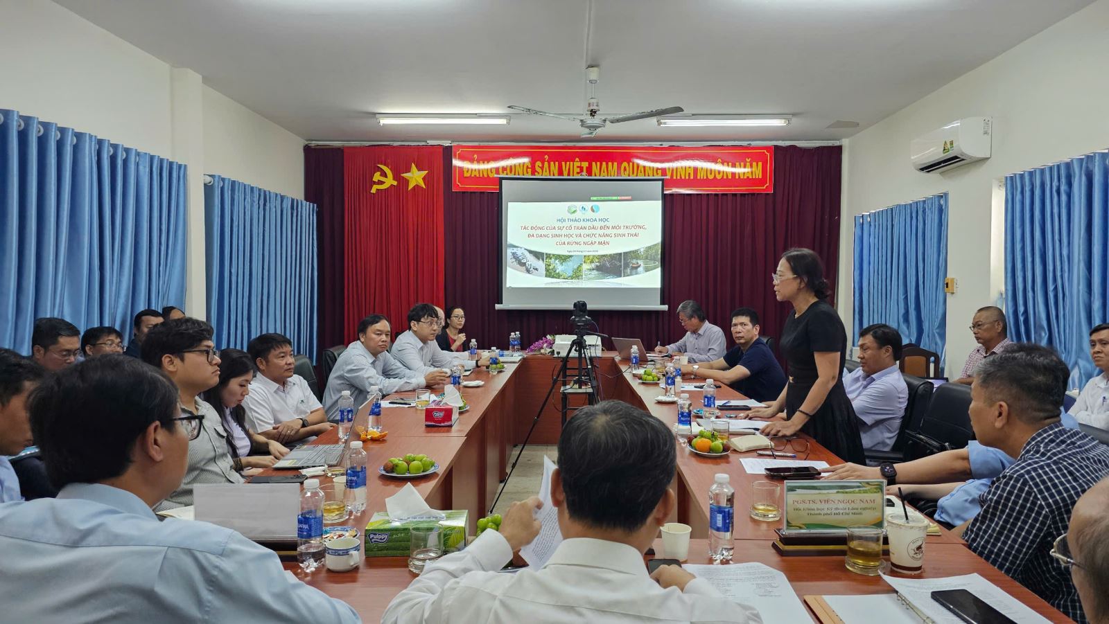 TS. Huỳnh Đức Hoàn – Giám đốc Ban Quản lý Rừng phòng hộ, đặc dụng TP.HCM – trình bày báo cáo về vai trò của rừng ngập mặn Cần Giờ đối với bảo vệ hệ sinh thái và phát triển bền vững của thành phố. Ông cũng nhấn mạnh sự cố tràn dầu đã gây ra những ảnh hưởng nghiêm trọng đến môi trường tự nhiên, đa dạng sinh học và sinh kế người dân.