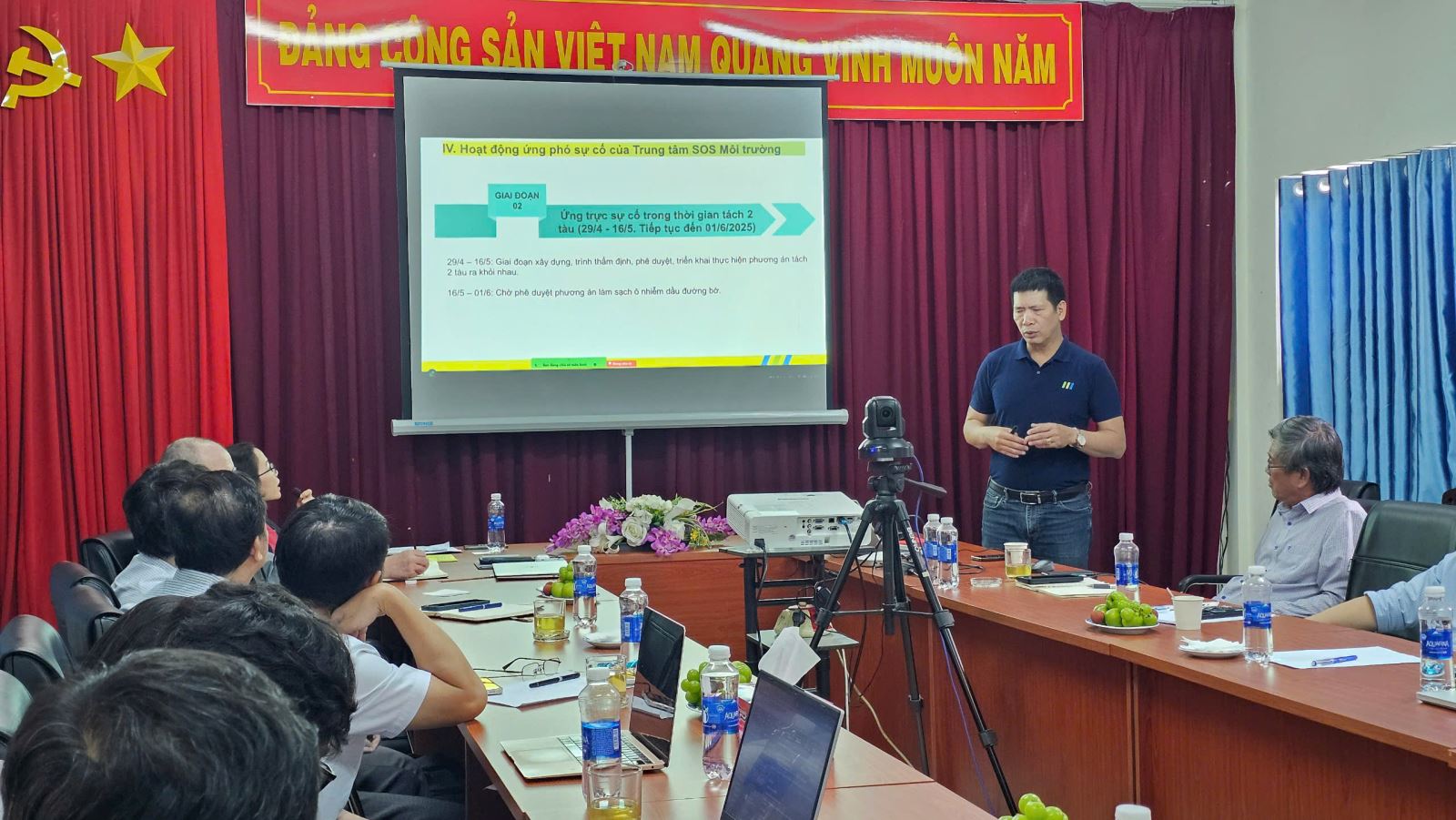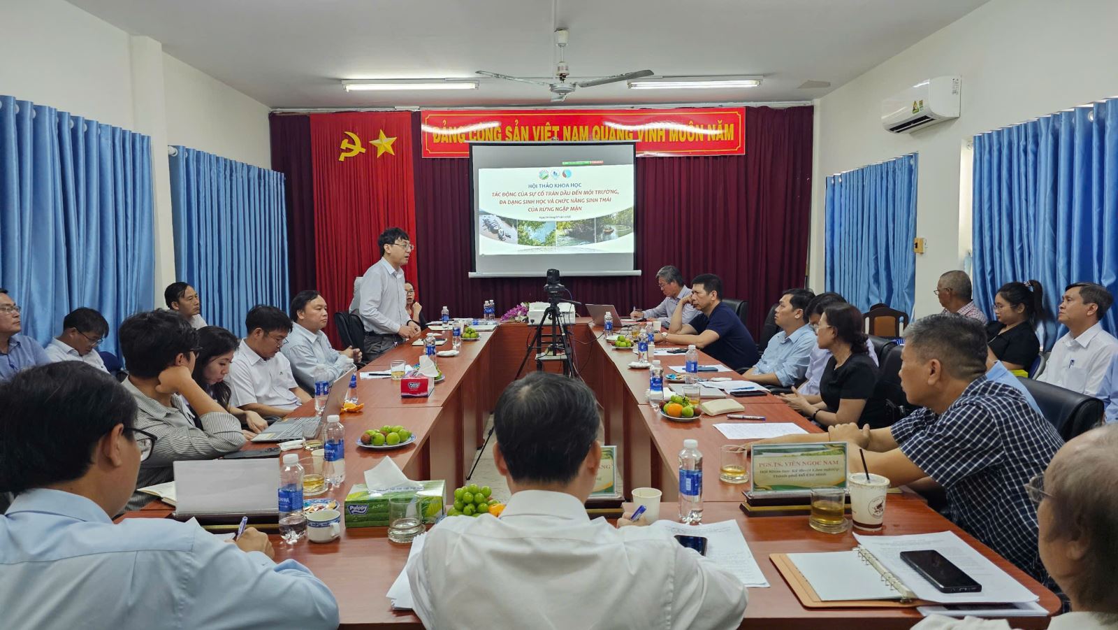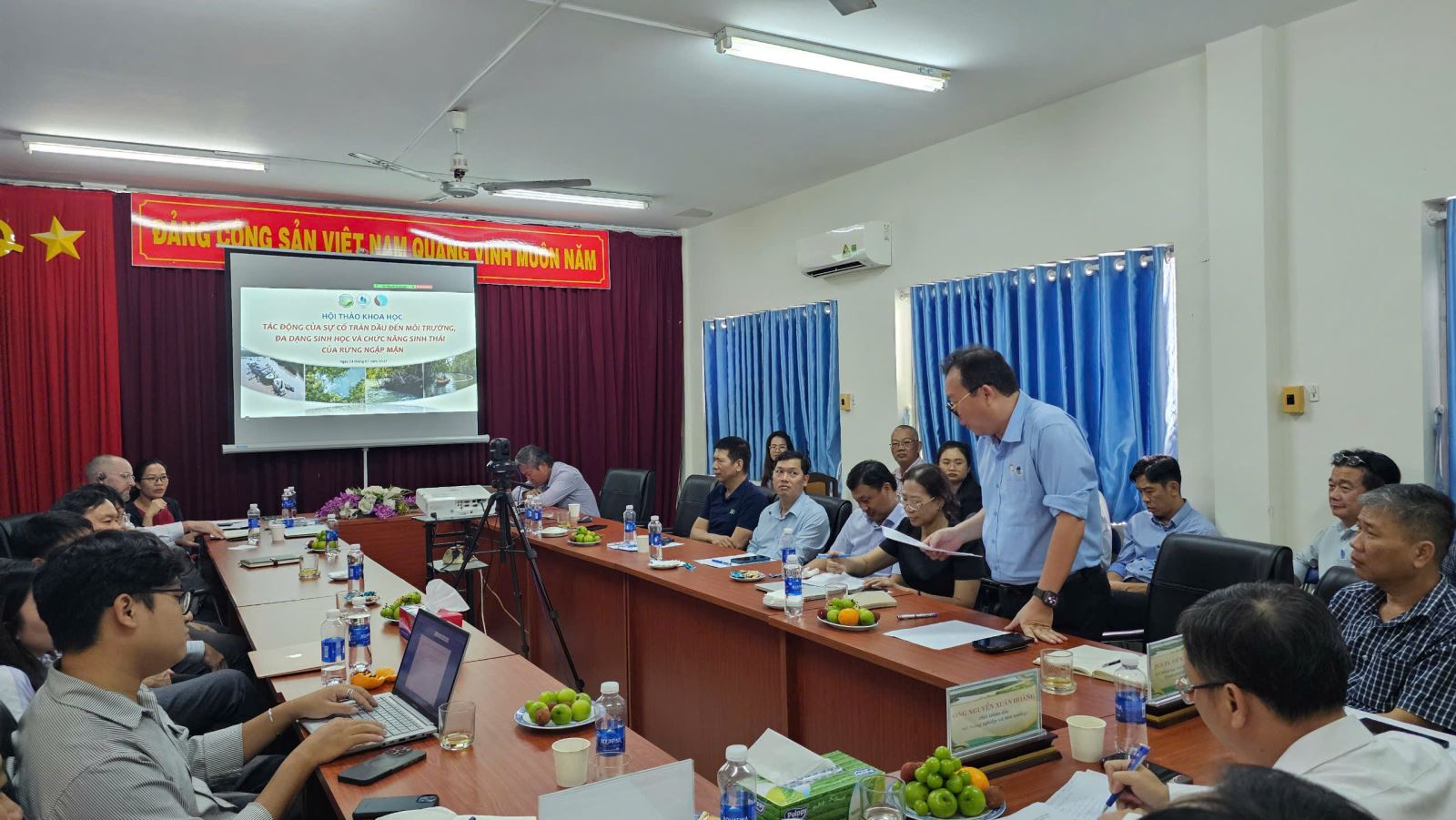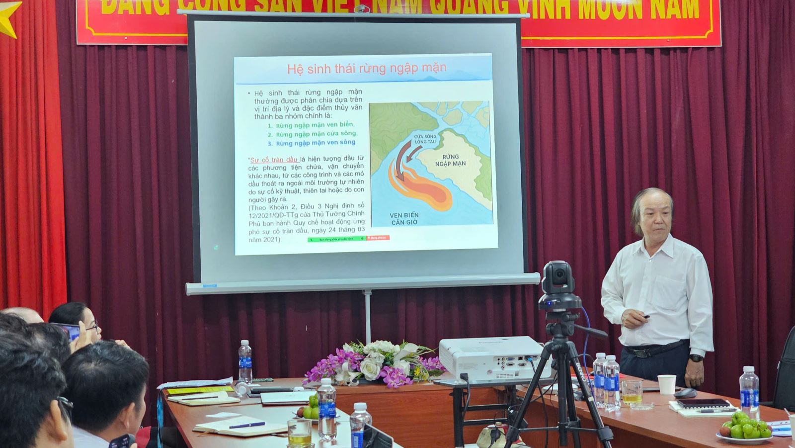 TS. Huỳnh Đức Hoàn – Giám đốc Ban Quản lý Rừng phòng hộ, đặc dụng TP.HCM – trình bày báo cáo về vai trò của rừng ngập mặn Cần Giờ đối với bảo vệ hệ sinh thái và phát triển bền vững của thành phố. Ông cũng nhấn mạnh sự cố tràn dầu đã gây ra những ảnh hưởng nghiêm trọng đến môi trường tự nhiên, đa dạng sinh học và sinh kế người dân.