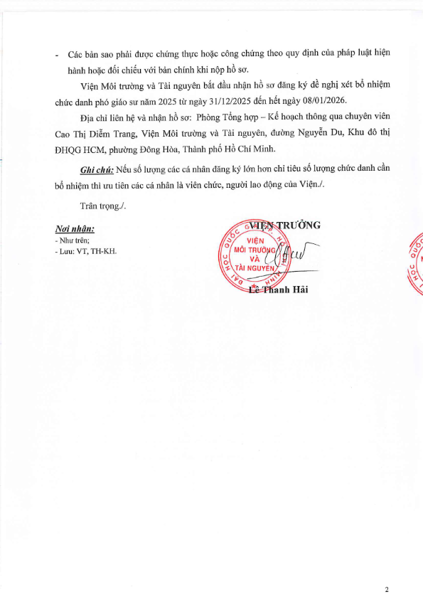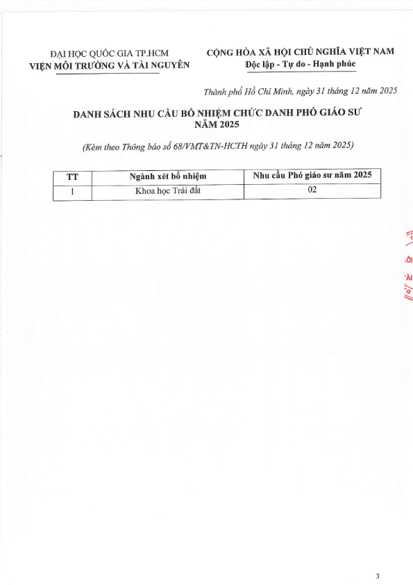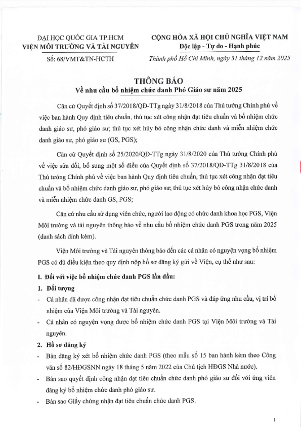Ngày 31 tháng 12 năm 2025, Viện Môi trường và Tài nguyên - Đại học Quốc gia TP.HCM ban hành công văn số 68/VMT&TN-HCTH thông báo về nhu cầu bổ nhiệm chức danh Phó Giáo sư năm 2025.