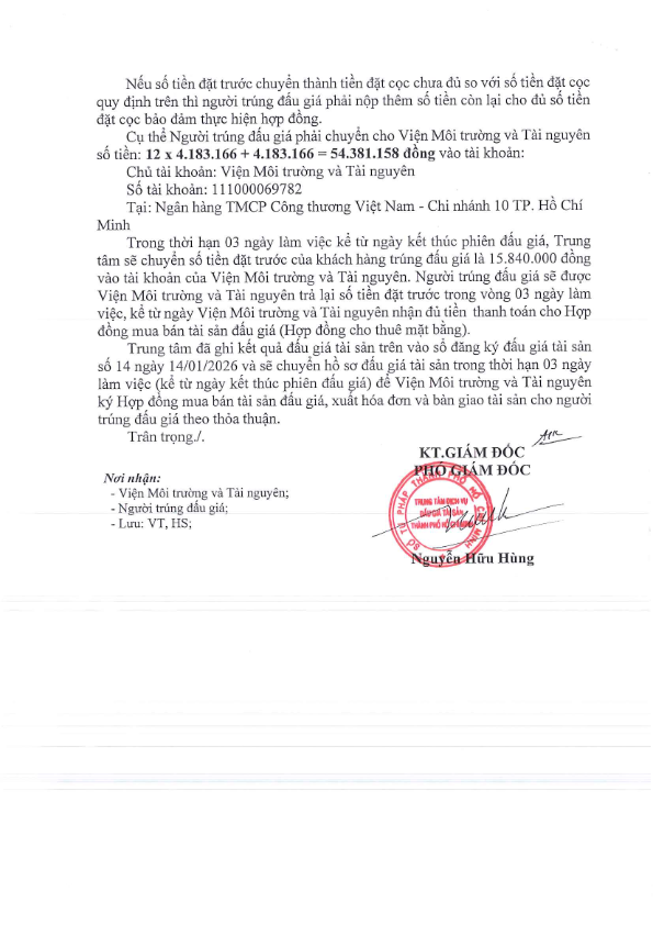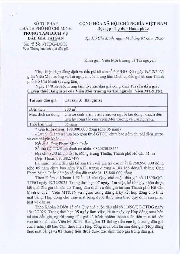 Ngày 14/01/2026, Trung tâm Dịch vụ đấu giá tài sản Thành phố Hồ Chí Minh tổ chức đấu giá công khai Tài sản đấu giá: Quyền thuê Bãi giữ xe của Viện Môi trường và Tài nguyên: